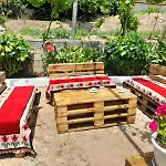 Von einer Terrasse der 1-Zimmer- Villa R-Ene Kolonje aus können Gäste einen Ausblick auf den Garten genießen.